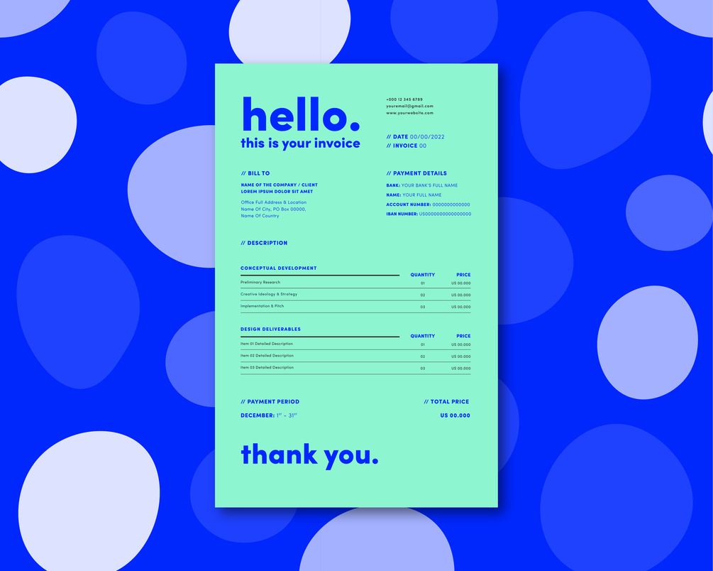 This is an easy, editable, and well-designed invoice template created to serve and help you get paid! Add or subtract items and deliverables as you see fit. Available in 3 separate color schemes inside an 'Adobe Illustrator' file. (Fonts included)